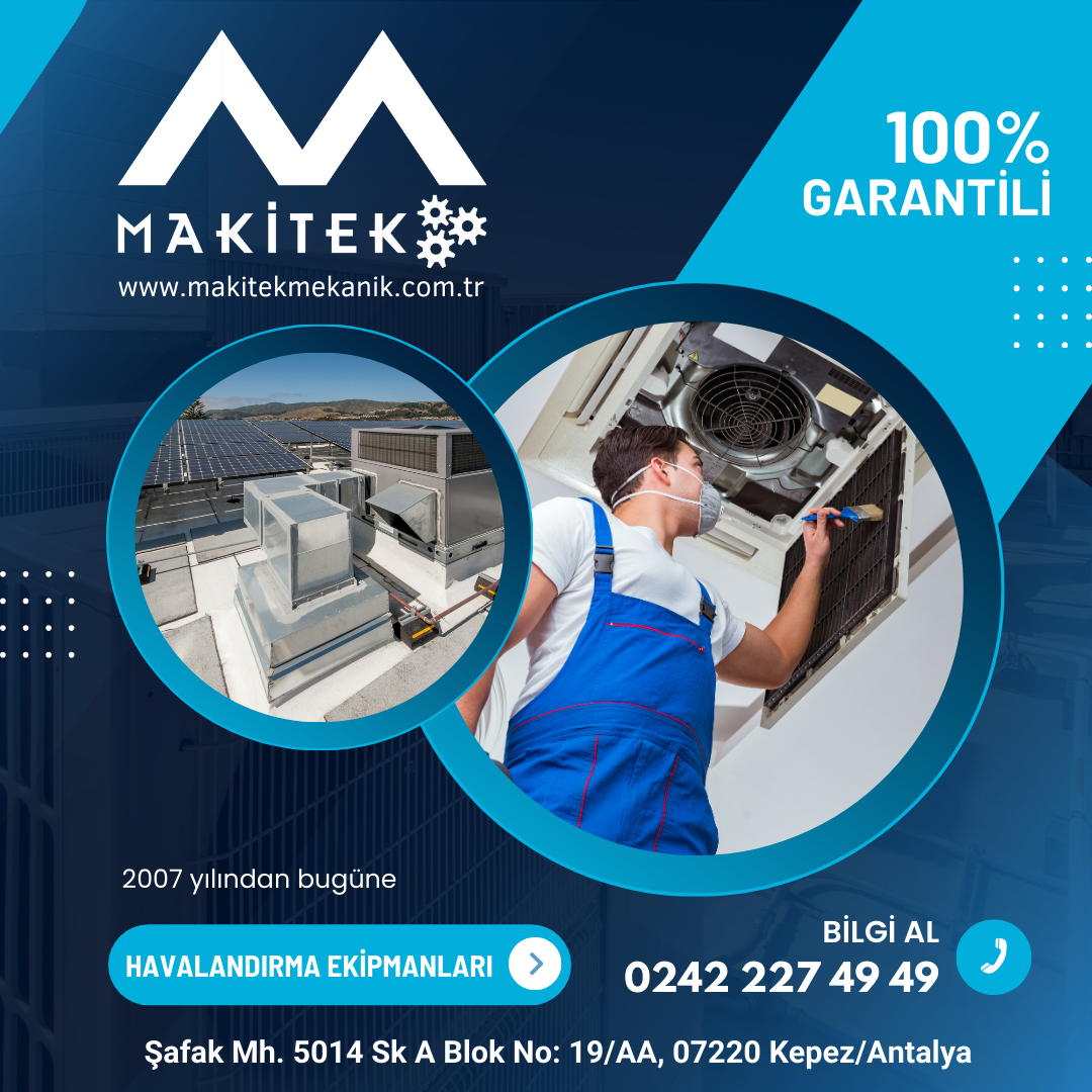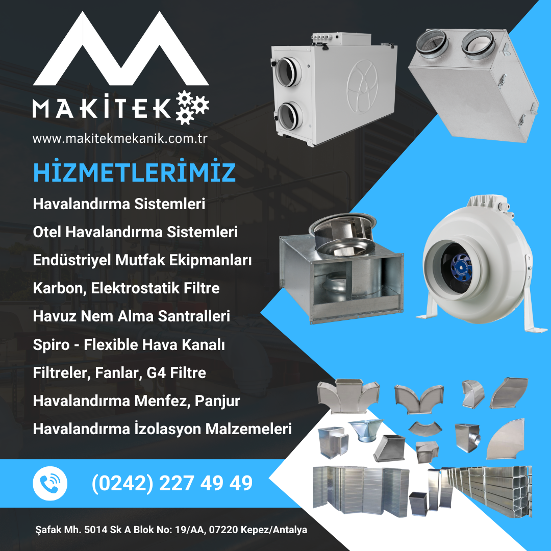Havalandırma Sistemleri, Otel Havalandırma Sistemleri, Endüstriyel Havalandırma, Karbon, Elektrostatik Filtre, Havuz Nem Alma Santralleri, Spiro - Flexible Hava Kanalı, Filtreler, Fanlar, G4 Filtre, Havalandırma Menfez, Panjur, Havlandırma İzolasyon Malzemeleri, Sulu Filtre, Toz Toplama Sistemleri, Havalandırma Ekipmanları Makitek Mekanik